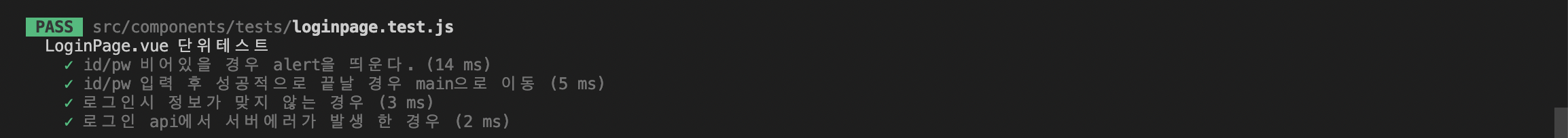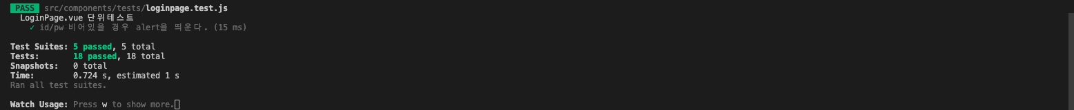 if๋ฌธ์ ์ญ์ ํ์๋ค. ์ด๋ฏธ submit ํจ์๋ฅผ ํตํด ๊ฐ์ด ๋น์ด์์ ๊ฒฝ์ฐ alert์ ํธ์ถํ๊ธฐ ๋๋ฌธ์ loginpage.test.js์์ ํธ์ถ์ฌ๋ถ๋ง ํ์ธํ๋๋ก ๋ฐ๊พธ์๋ค. ๊ทธ๋ฆฌ๊ณ ๋ง์ง๋ง์ผ๋ก mockClear๋ฅผ ํตํด ๋น์์คฌ๋ค.