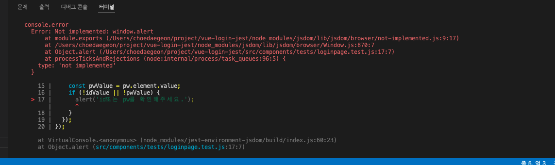 ์ฒ์์๋ test์ฝ๋์์ alert์ ํธ์ถํ์์ผ๋, ์์ฑํ๋ค๋ณด๋ ์๋ณธํ์ผ์์ alert์ ํธ์ถํ๋๊ฒ ๋ง๋๊ฒ ๊ฐ์, LoginPage.vue์ id,pw์ ๋น์ด์์ ๊ฒฝ์ฐ ์ถ๊ฐํ์๋ค.