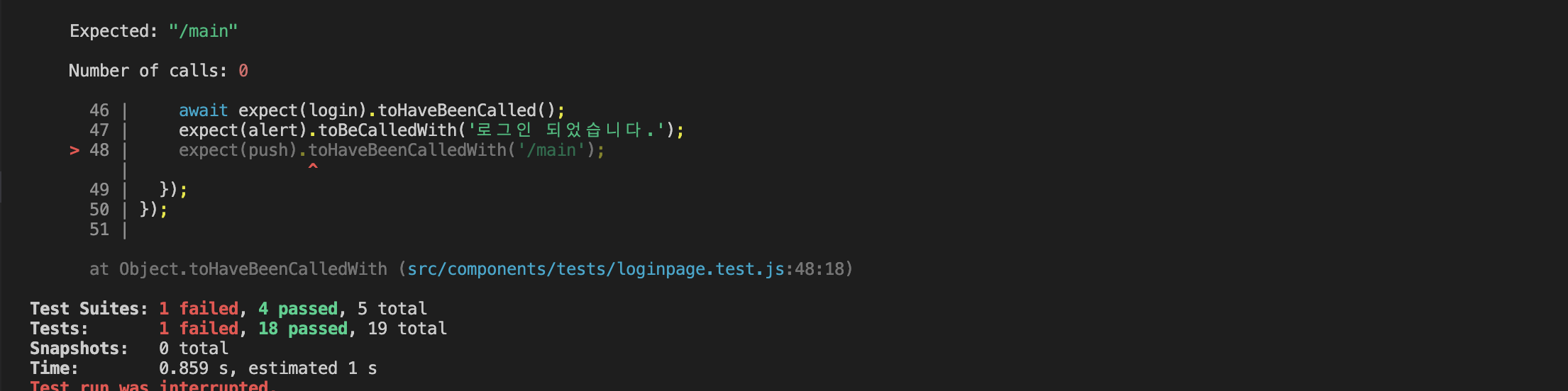 push๊ฐ '/main'์ผ๋ก ํธ์ถํ์๋์ง ๊ฒ์ฌํ๊ธฐ ์ํด toHaveBeenCalledWith๋ฅผ ์ฌ์ฉํ์๋ค.