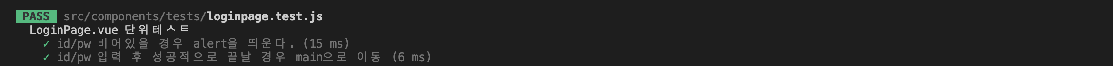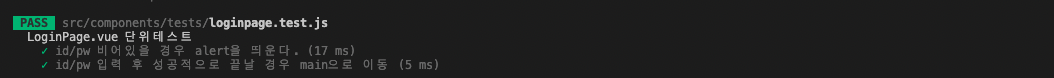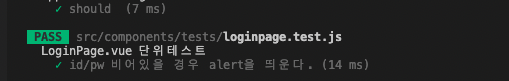 ๊ทธ๋ฆฌ๊ณ loginpage.test.js์์๋ idValue,pwValue๊ฐ ๋น์ด์์ ๊ฒฝ์ฐ alertํจ์๊ฐ "id๋๋ pw๋ฅผ ํ์ธํด์ฃผ์ธ์." ๋ฅผ ํธ์ถํ์๋์ง ํ์ธํ๊ธฐ ์ํด toBeCalledWith๋ฅผ ์ฌ์ฉํ์๋ค.
