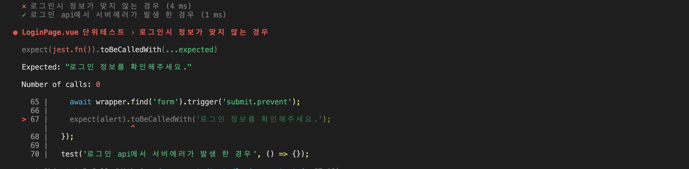expect(alert).toBeCalledWith('๋ก๊ทธ์ธ ์ ๋ณด๋ฅผ ํ์ธํด์ฃผ์ธ์.');