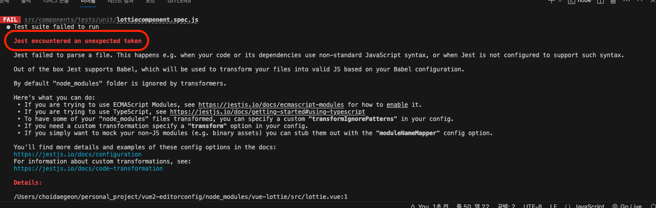 아래오 같이 발생할 경우 jest.config.js에서 "transformIgnorePatterns" 에 vue-lottie를 추가해준다.