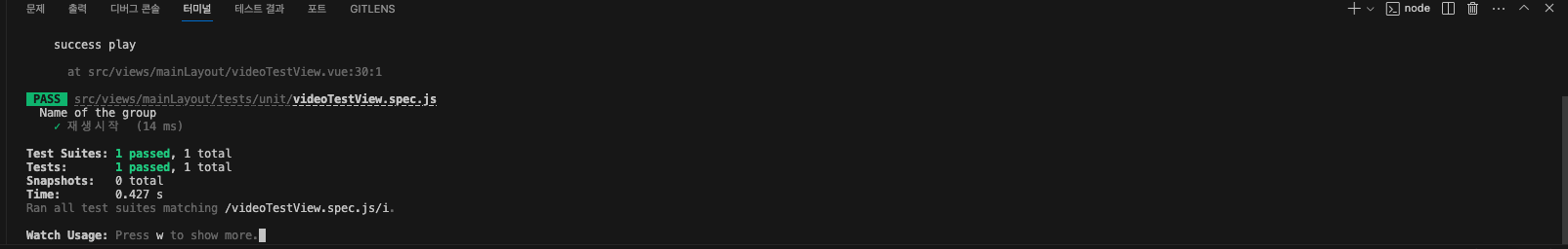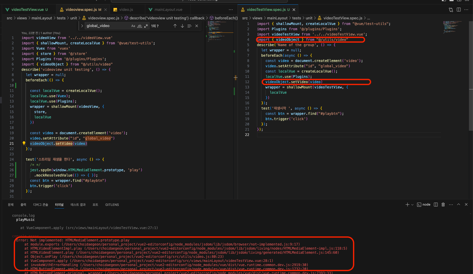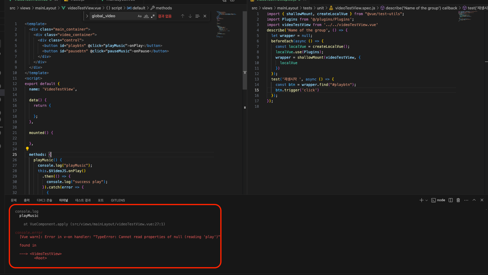 단위테스트 실시하는 경우 videoTestView에서 재생버튼을 호출하면, video 태그가 존재하지 않기 때문에 오류가 발생한다.