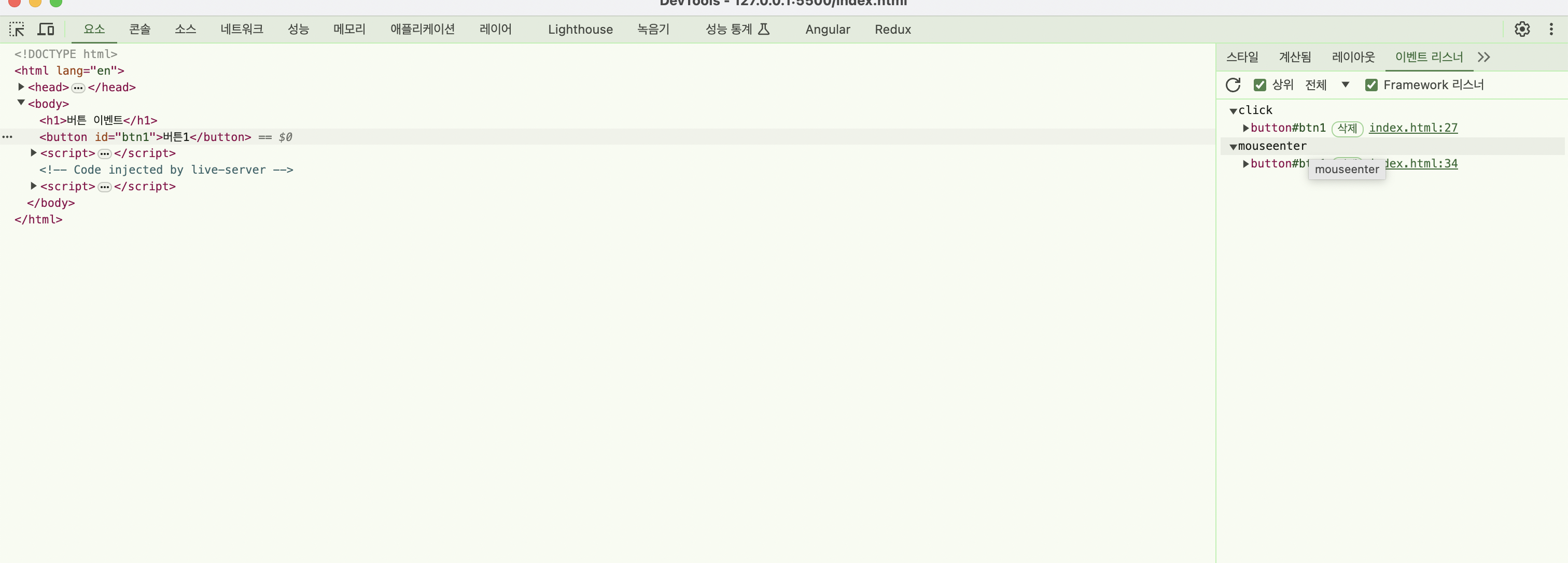 ์๋ ์ฒ๋ผ click,mouseenter์ด๋ฒคํธ๊ฐ ์ ์์ ์ผ๋ก ๋ฑ๋ก๋ ๊ฒ์ ํ์ธํ ์ ์๋ค