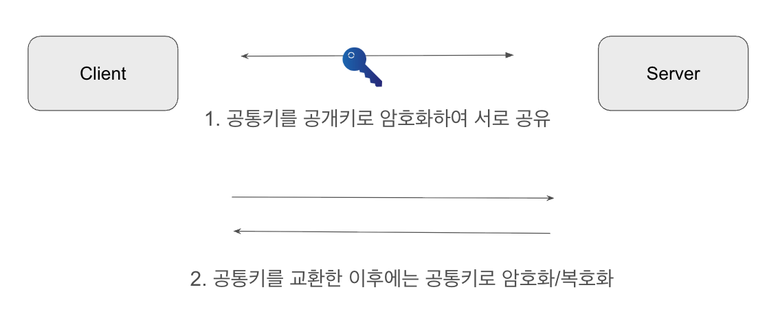 - 메세지를 주고 받을때마다 공개키 방식을 사용할 경우, 처리속도가 느려짐 그리하여 공통키를 공개키를 이용하여 암호화하여 전달 , 이후에는 공통키를 통해 암호화/복호화