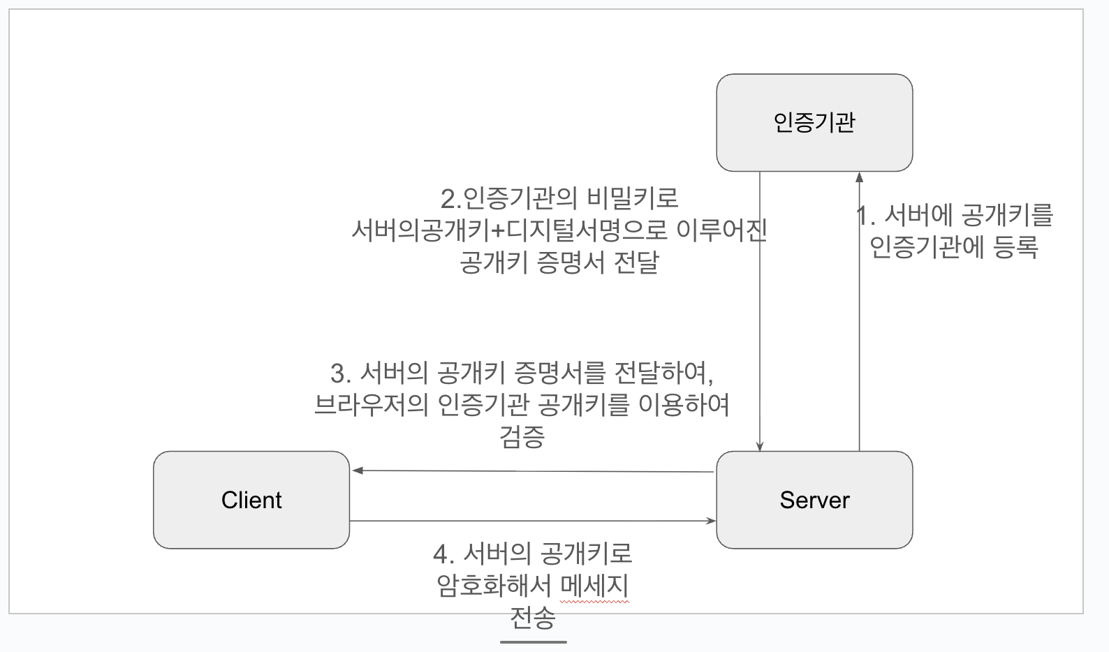 아래 그림처럼 서버의 공개키를 인증기관에 전달하고 서버의 공개키를 제출하면 인증기관에서 공개키 + 디지털서명을 전달하며,