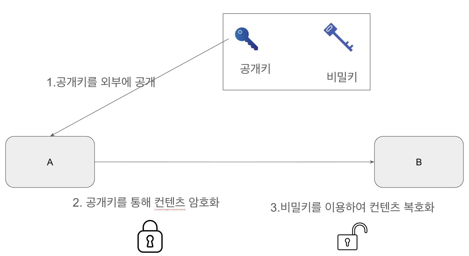 - 공개키와 비공개키를 사용하며, 공개키는 외부에 공개되어도 되지만, 비공개키는 외부에 노출이 되면 안되는 키이다.