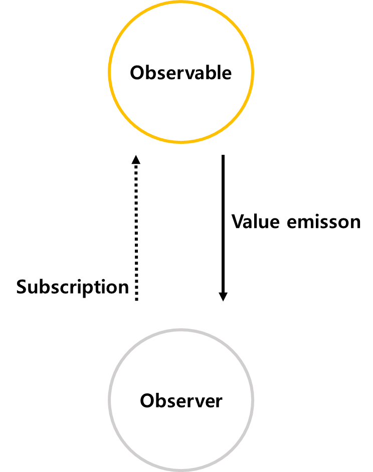 Observable ์ด ๋ฐ์ดํฐ๋ฅผ ๋ฐฉ์ถํ๋ฉด, Observable๋ฅผ ๊ตฌ๋ ํ๋Observer๋ ๋ฐ์ดํฐ ๋ณํ์๋ฐ๋ผ ๋ฐ์ํ๋ค๋ผ๊ณ ์๊ฐํ๋ฉด ๋ ๊ฒ ๊ฐ์ต๋๋ค.