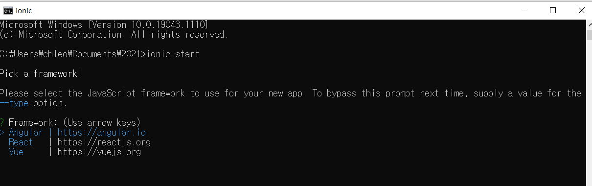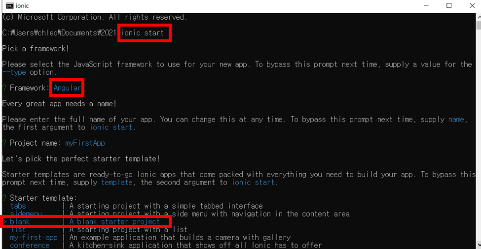 ์ผ๋จ ์ํ๋ ํด๋์์ cmd์ฐฝ์ ๋์ด ํ์ ionic start๋ฅผ ์ ๋ ฅํด์ฃผ์ธ์. ์ ๋ ํ์ฌ์์ angular๋ฅผ ํ๊ธฐ๋๋ฌธ์ angular๋ฅผ ์ ํํ์๊ณ template์ blank๋ฅผ ์ ํํ์์ด์.~