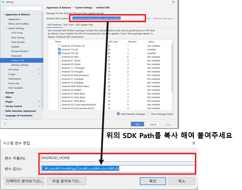 ์๋ก ๋ง๋ค๊ธฐ ํ SDK๊ฒฝ๋ก๋ฅผ ๋ณต์ฌํ์ฌ ๋ณ์๊ฐ์ ์ถ๊ฐํด์ฃผ์ธ์.~