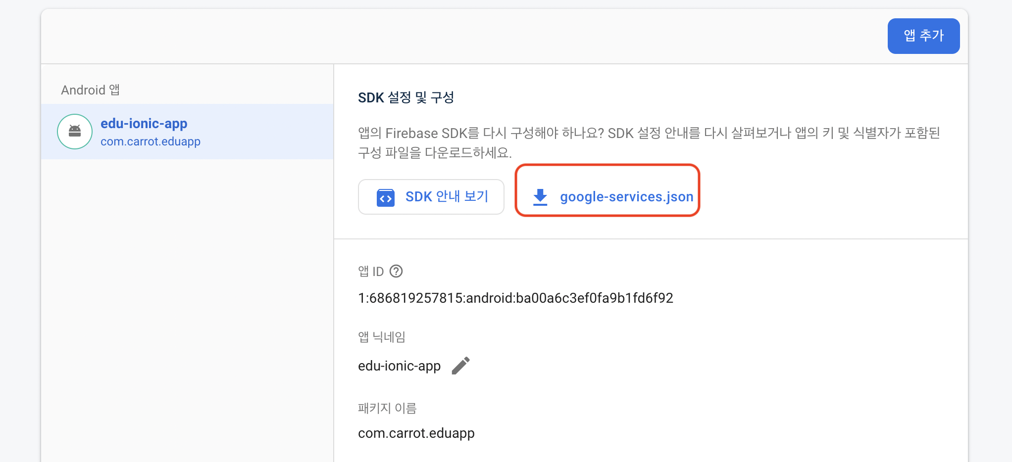 생성완료가 되었다며, 아래 사진처럼 google-services.json을 다운받는다.